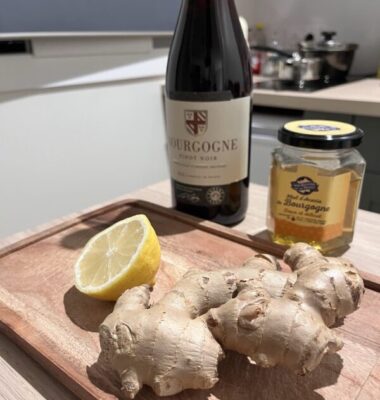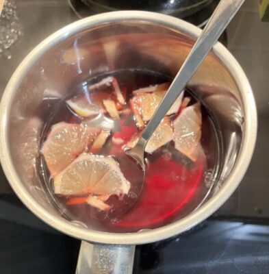 本来のグロッグはラムをベースに作るようですが、今は厳密なレシピはないようです。私は少し工夫をして、鍋にブルゴーニュ産のはちみつ、スライスしたレモン、そしてスライス&チーズおろしですりおろしたしょうがを加え、これまたブルゴーニュ産のピノノワールを注いで温めました。