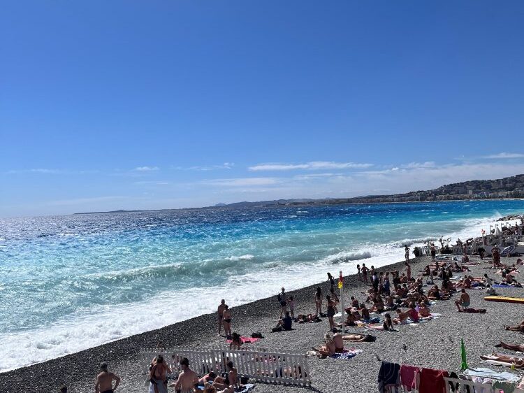 まず、ニースの海岸は砂ではなく丸い小石(galets)でできているため、波が打ち寄せても細かな砂が舞い上がらず、あまり水が濁りません。足元で石が転がる音が響くあの独特の浜辺は、海の透明度を支える大切な要素でもあります。