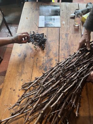 畑から伐ってきたブドウの枝を分割し、表面を均して地に根付くよう切り込みを入れました。ぶどうは生命力があるので、土に挿すと根を生やすそうです。