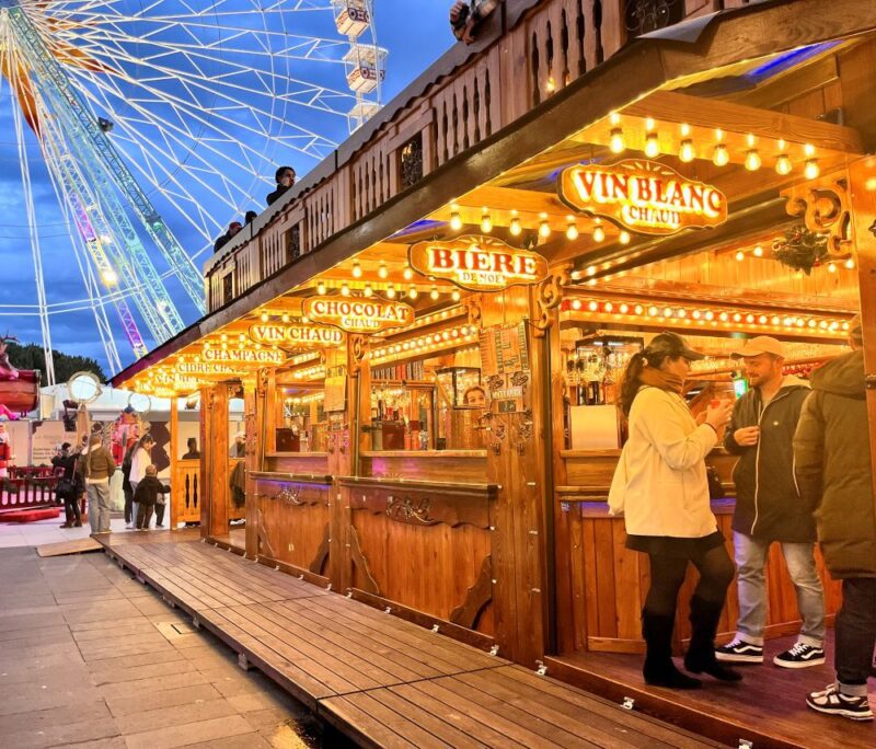 屋台にはホットワイン(vin chaud)やホットチョコレート、クレープ、ソーセージ、焼き栗など、フランス各地のクリスマスマーケットでおなじみの品が揃います。甘い香りとスパイスの匂いが混ざり合い、冬らしい空気を作り出していました。