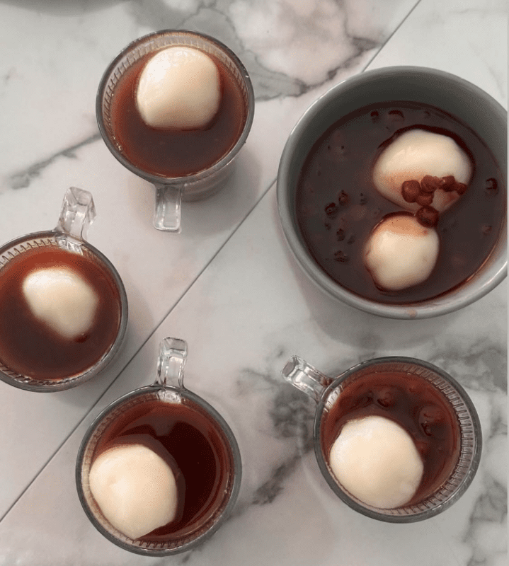 白玉粉で作った、丸くつやつやのお団子に、小豆と水分多めの汁を。素朴ながら、「Mochiを食べるの初めて」と好評でした。