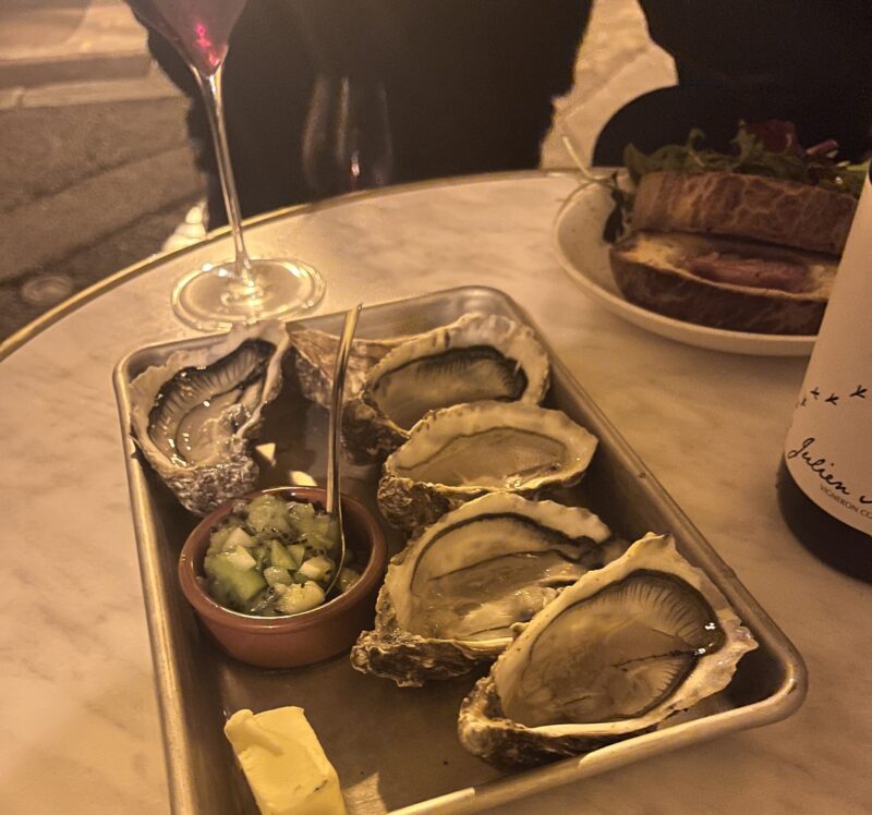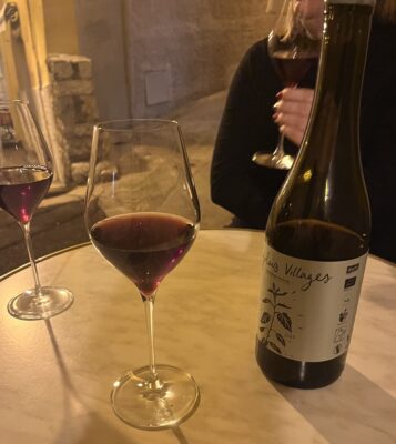 しかし解禁日とあって、この日のワインバーの多くは要事前予約。一軒目のワインバーでは、若いムッシュおすすめのボジョレー・ヌーヴォー・ヴィラージュをいただきました。